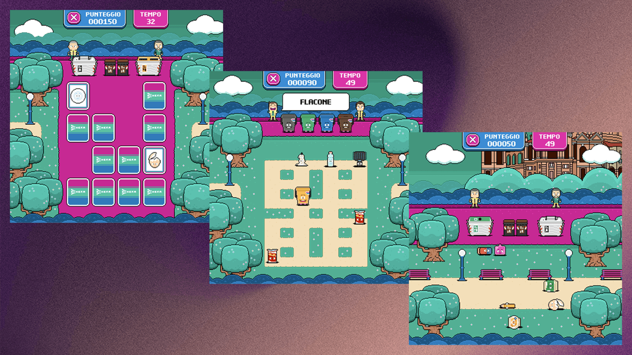 Gli “Eco Games” sono un gruppo di tre mini giochi in cui i protagonisti sono sempre i rifiuti di ogni tipologia: organico, plastica, carta, indifferenziato. Con tre meccaniche di gioco il giocatore può mettersi alla prova e dimostrare di riconoscere il rifiuto, categorizzarlo e cestinarlo nel contenitore corretto.